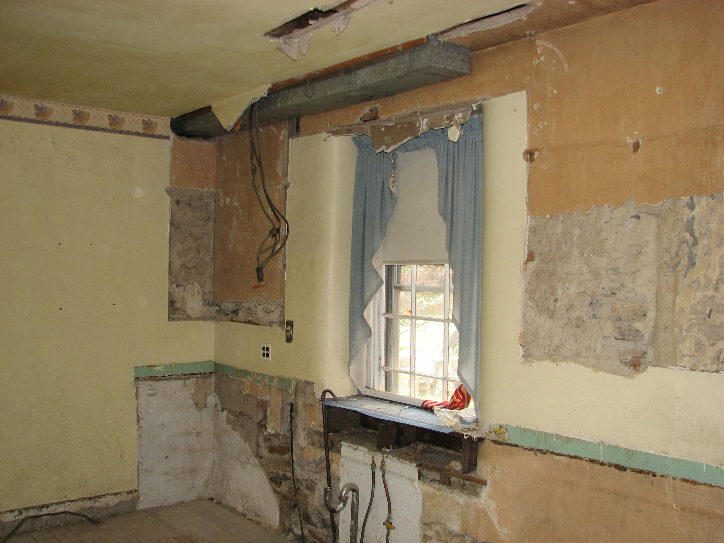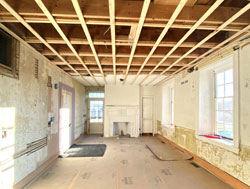 The Dining Room ceiling had been partially removed in the 1950s when the property was made into a duplex. A drop ceiling had been installed to hide the plumbing and electrical work installed at the time. In 2010 the ceiling, plumbing and electrical work was removed leaving the ceiling open. After reinforcing the beams, a new ceiling was installed. Below are photos before, during and after the ceiling replacement.
