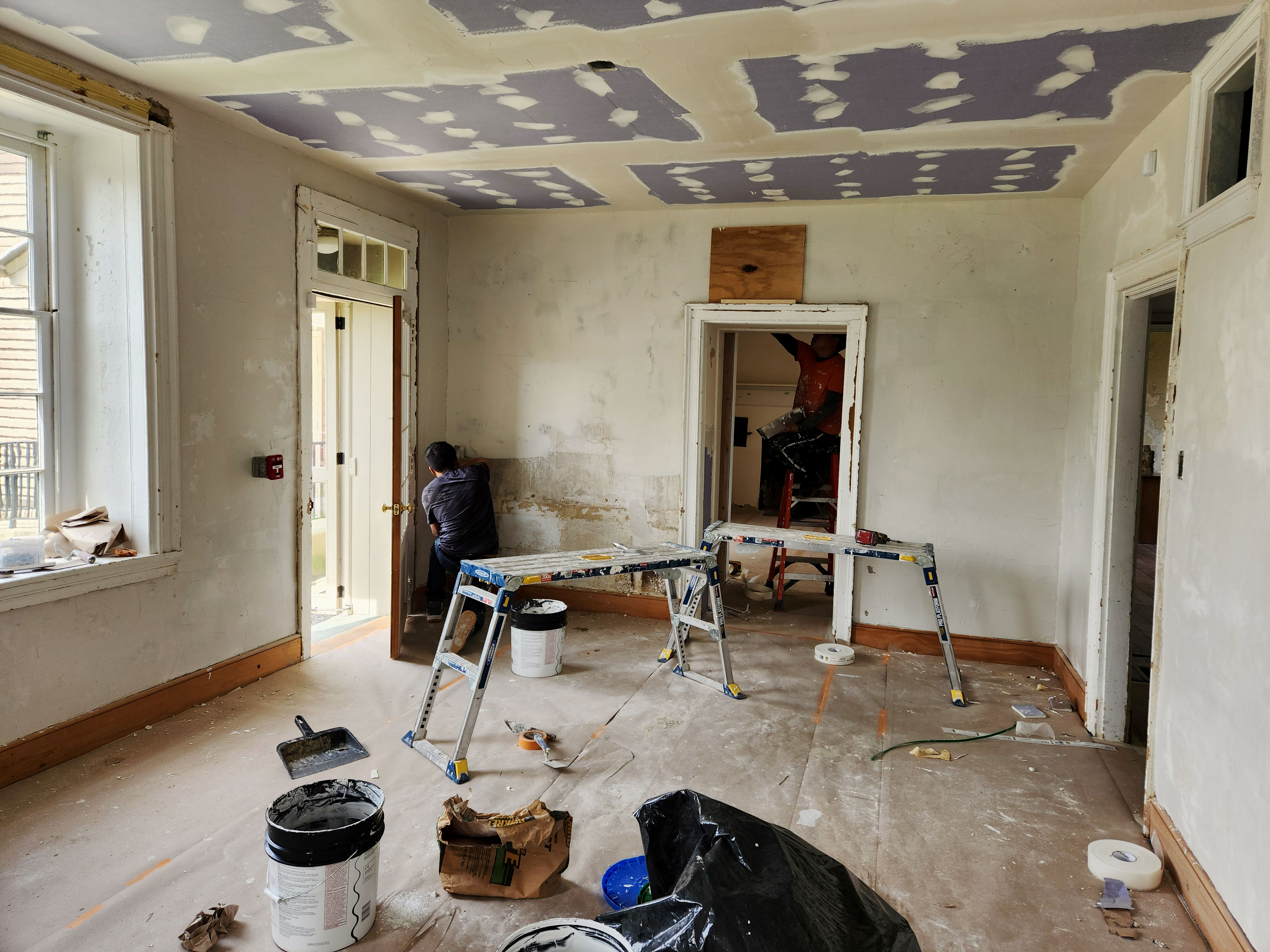4. The plaster was repaired in the dining room, kitchen and hall and all of the rooms painted with primer.