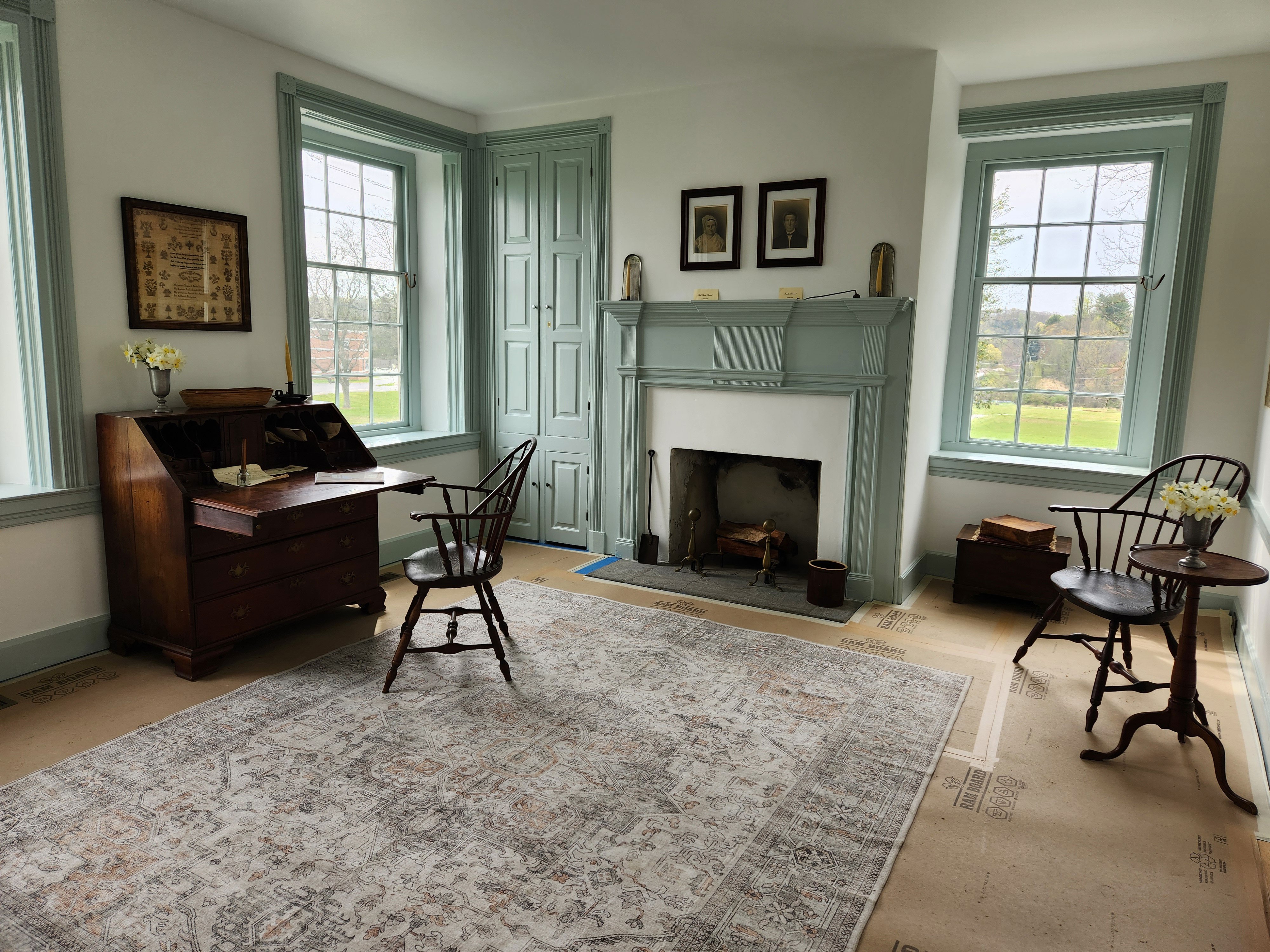 The 1829 parlor has been painted using original colors identified in the Preservation Plan and furnished in period furniture and accessories. The missing ceiling in the dining room was replaced and the plaster repaired. An enclosure has been built where the original servants staircase was located in the kitchen, restoring the 1850s look of the area. Plaster was also repaired in the kitchen and hall. Electrical wiring was upgraded on the first floor providing electrical service to all rooms. For details on restoration work click 2025 Projects Completed.