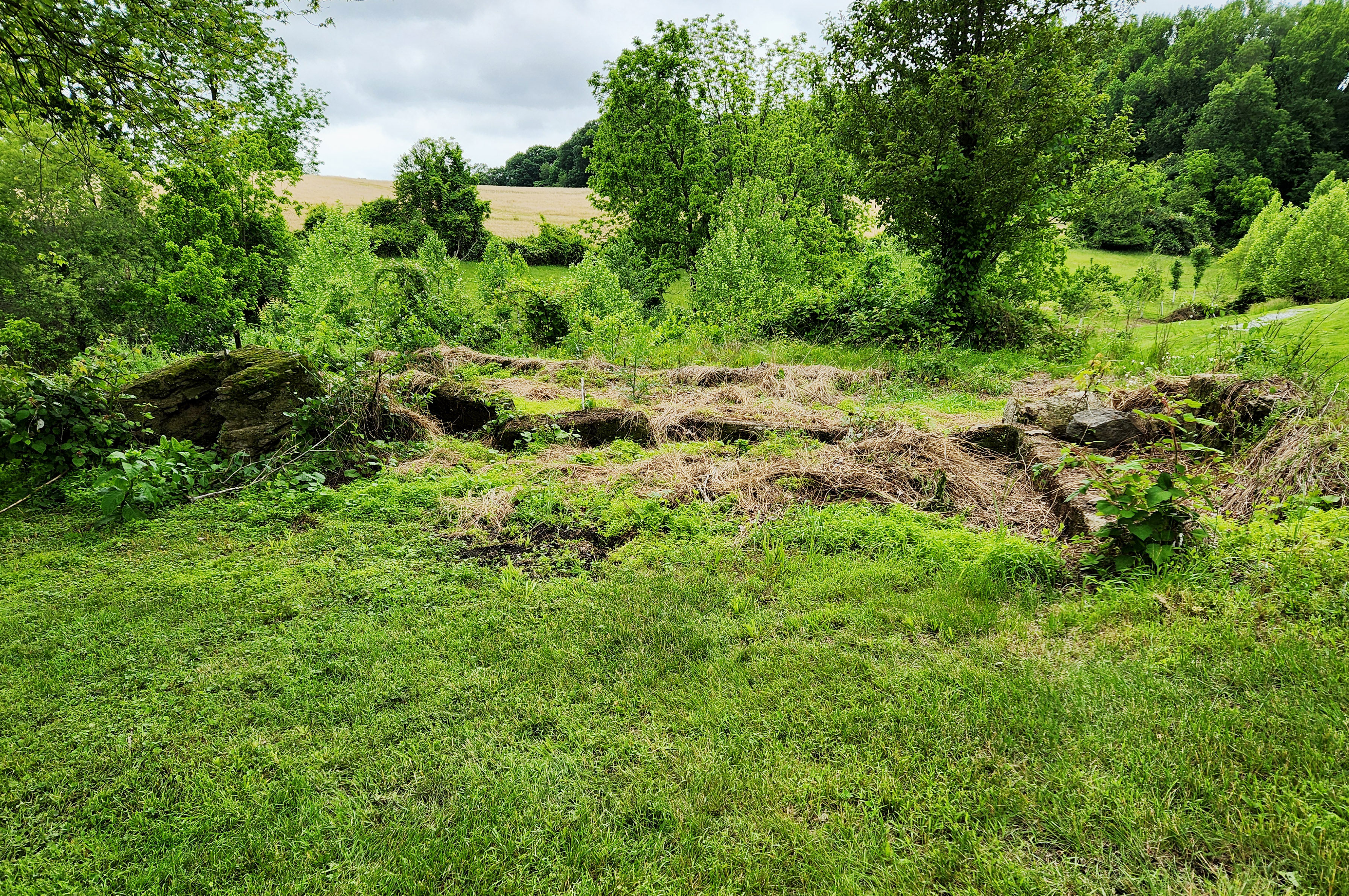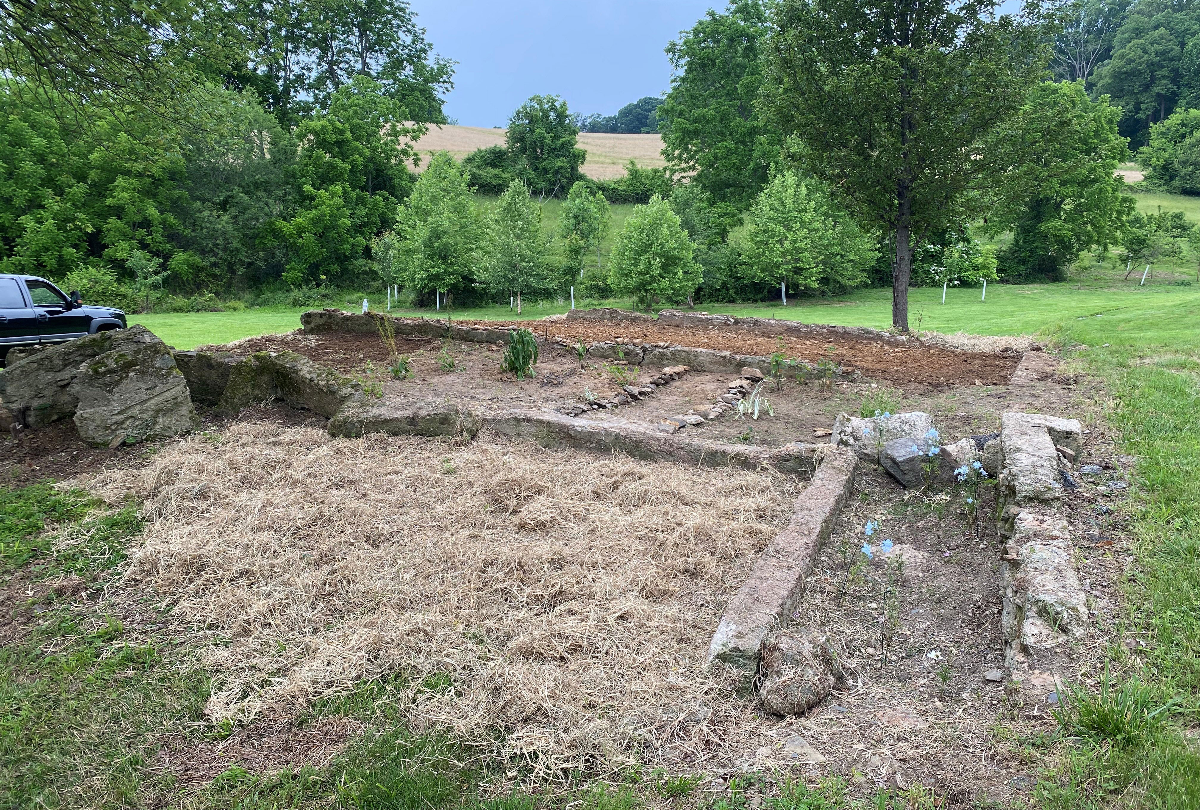 The old dairy barn walls were barely visible due to decades of overgrowth. The cow shed, built in 1856, extended from the main barn (which is partly where the upper parking area is now). When Chester County took ownership of the property in the late 1950s, they tore the dairy barn down. In May, a volunteer was metal detecting around the barn foundation and decided to clear away some of the overgrowth. This led to a full blown clean-up project with the help of the township maintenance crew. The cleared area will be a flower garden for all to enjoy. Below are before and after photos of the foundation clearing.