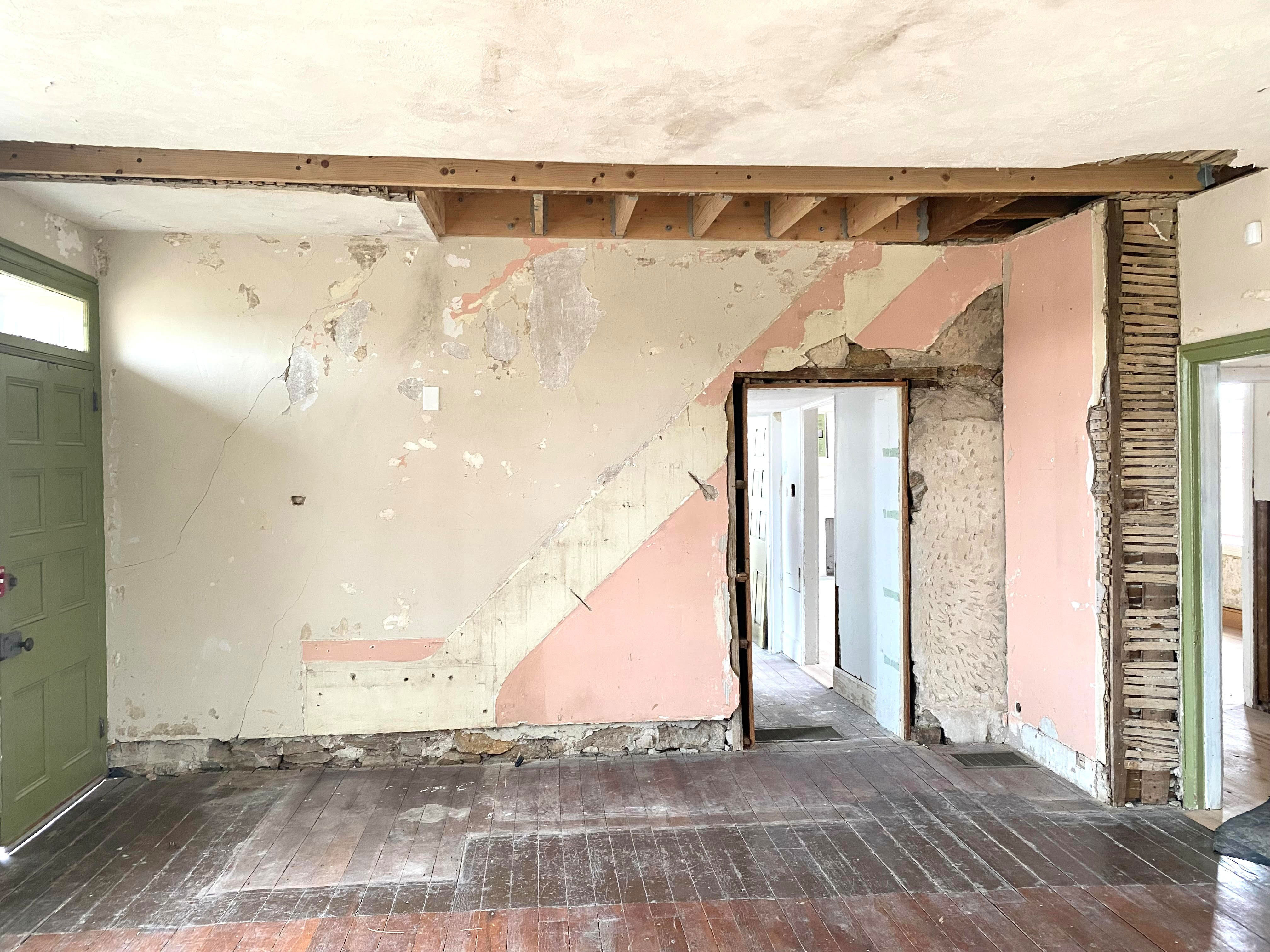 We have been awarded a Keystone Construction Grant by the Pennsylvania Historical and Museum Commission (PHMC) to refurbish the plaster in the c. 1841 Gathering Room at Barnard Station. As with any original material, movement of the structure and moisture intrusion has decayed the plaster system over the past 184 years. The causes of these problems have been addressed so the time has come to repair the internal finishes. The contractor will employ both traditional and modern methods to prepare the walls and ceiling for layers of a wet plaster system. The room was initially plastered in 1841 and has at least one subsequent layer applied to the walls. The bond between those layers has been compromised and the finish has started to break off.